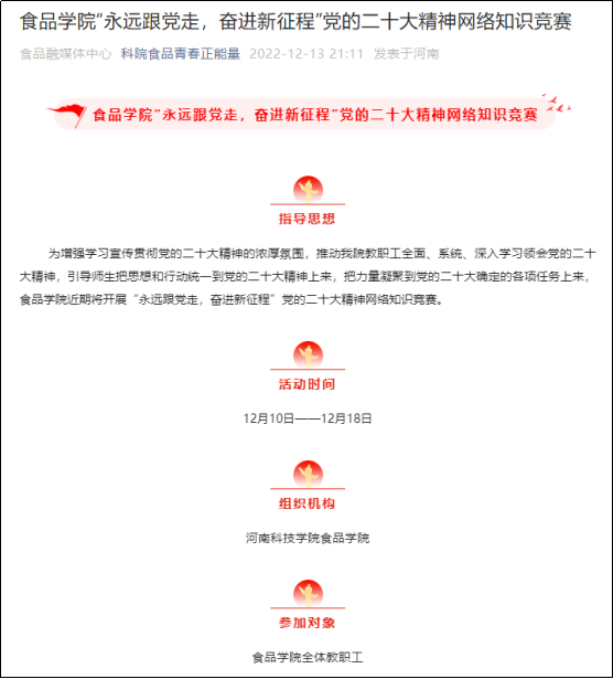 为增强学习宣传贯彻党的二十大精神的浓厚氛围,推动我院教职工全面、系统、深入学习领会党的二十大精神,引导师生把思想和行动统一到党的二十大精神上来,把力量凝聚到党的二十大确定的各项任务上来,食品学院12月10日至12月18日开展了“永远跟党走,奋进新征程”党的二十大精神网络知识竞赛。