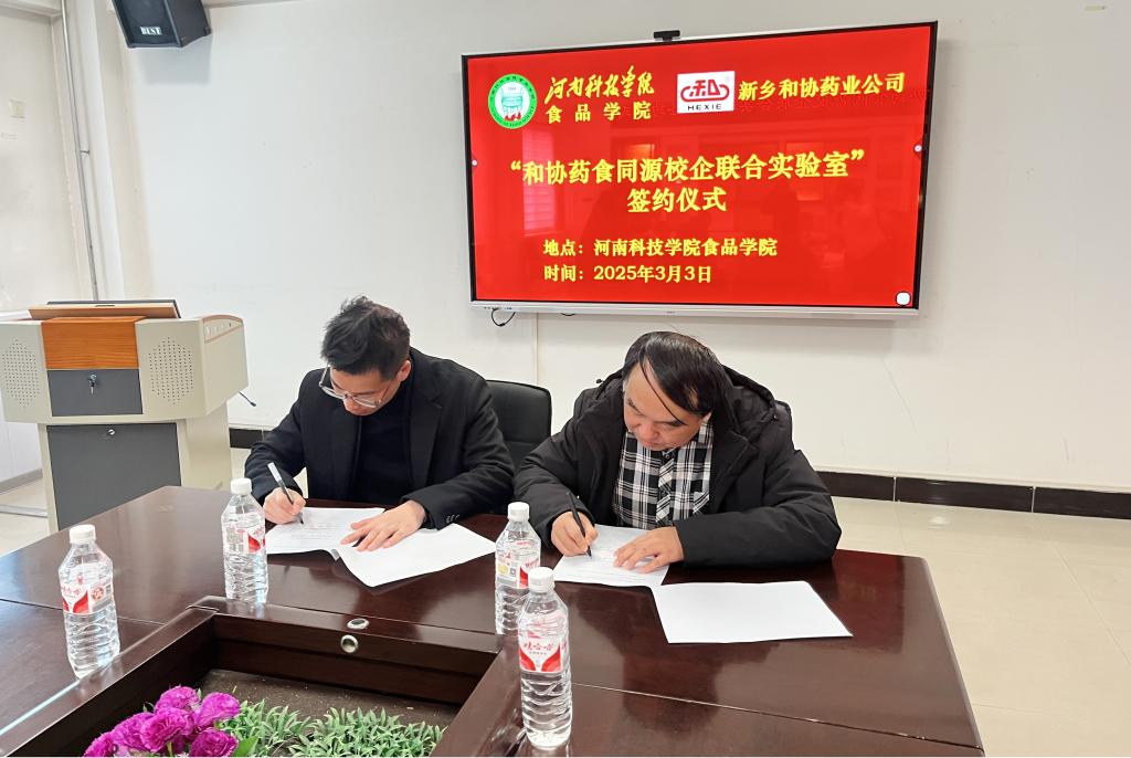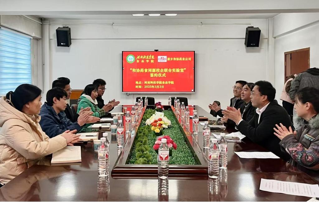 3月3日下午,食品学院与新乡市和协动物药业有限公司在食品学院三楼304会议室举行合作签约暨“和协药食同源校企联合实验室”揭牌仪式。新乡市和协动物药业有限公司总经理张作栋、生产部经理杨景鹏、供应部经理张宪璘、质检部经理张金艳,食品学院负责人和校企共建联合实验室成员参加了会议。会议由食品学院副院长张令文主持。