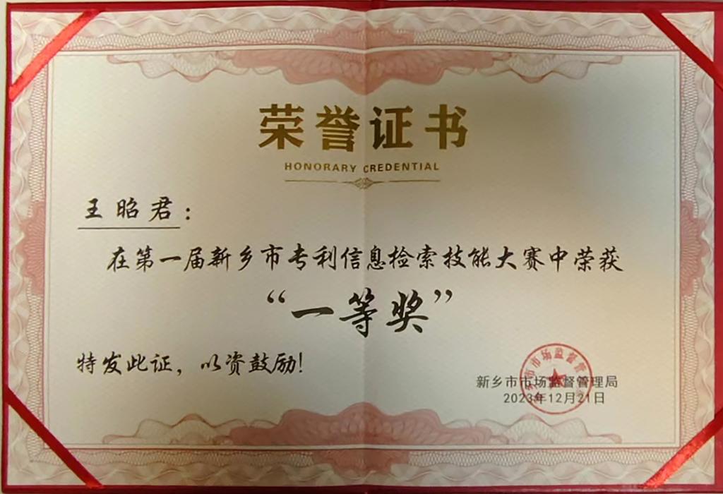 通过理论考核,检索实操,经大赛组委会专家组审定,其中王昭君荣获新乡市专利信息检索技能大赛一等奖(全市一等奖2名,王昭君全市第1名)。