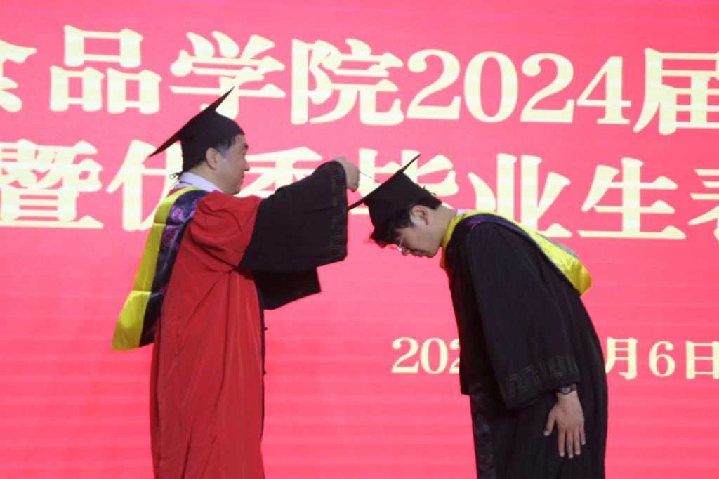 在热烈的掌声中,食品学院学位委员会主任李光磊教授为2024届毕业生扶正流苏并颁发学位证书,为每一位毕业学子送上学院最深切的祝福与期盼。