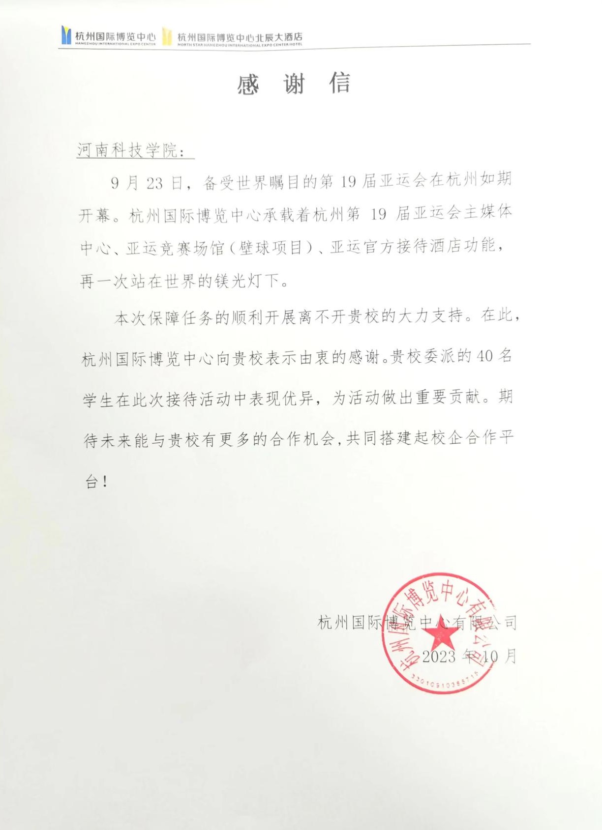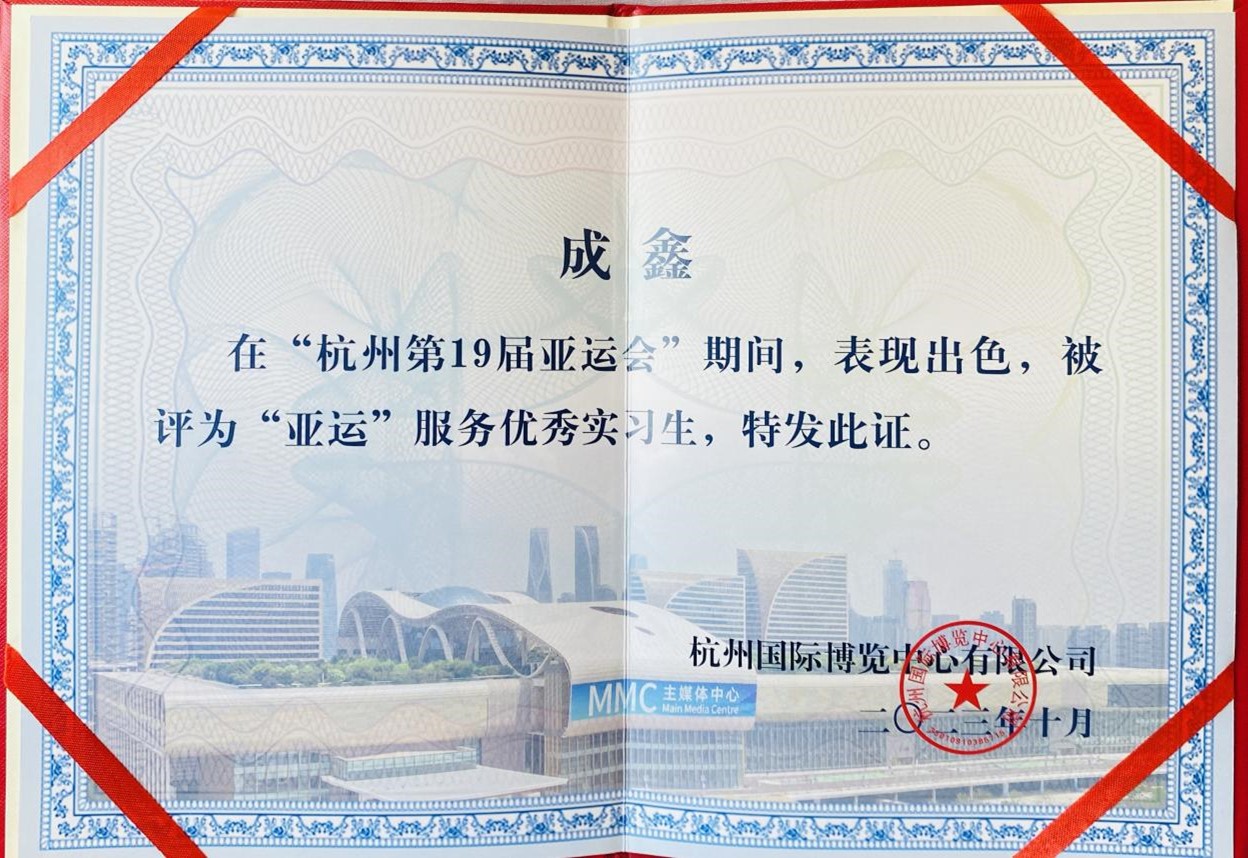今年7月份至10月份,受杭州国际博览中心委托,食品学院选拔了40名学生参加了亚运会和亚残会的服务保障工作。服务期间,学生们展现了优秀的专业能力和职业素养,为保障杭州亚运会圆满成功作出了积极贡献。其中,成鑫同学获得了“亚运优秀服务实习生”荣誉称号,侯思盈同学获得了运营部技能竞赛一等奖。