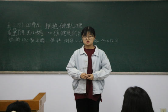 比赛中,参赛选手按照顺序依次上台进行演讲,他们神采飞扬、激情满满的从不同的角度向大家诠释了心理健康的重要性。评委们依次对各位参赛人员的演讲进行了点评与指导。经过激烈角逐,旅游193班李积英获得了比赛第一名。