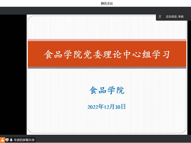 12月30日上午,食品学院党委理论学习中心组举行集中学习会,会议通过线上方式进行,全体党委委员、正科级干部、专业负责人参加,会议由学院党委书记李波主持。