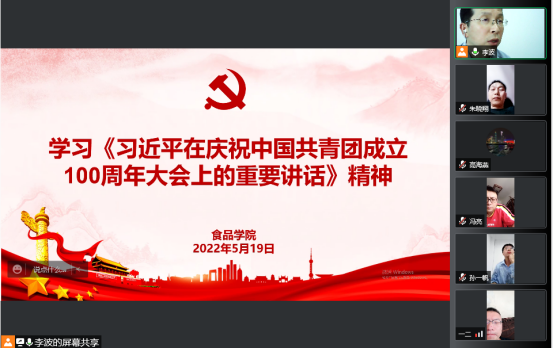 5月19日下午,食品学院通过腾讯会议形式集中学习习近平总书记在庆祝中国共产主义青年团成立100周年大会上的重要讲话精神,学院全体教工参加了会议,会议由学院党委书记李波主持。