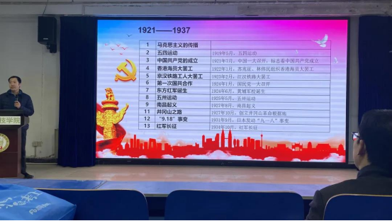 院党委书记李波通过建党百年脉络图和建党百年阶段图,讲述了中国共产党的发展历程。他强调各位党员,要以史为镜,不忘初心,永葆共产党的政治本色,不断增强党性修养,汲取党史智慧。学生第一党支部书记杨胜利作为第一讲讲述人,以时间线的形式,图文并茂的将1921年-1937年期间的峥嵘岁月与参会教职工进行了分享和学习,诠释了我党不畏艰险,全心全意为人民服务的优良革命精神。