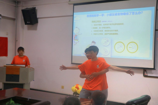 科普讲堂上,食品质量与安全203班宋琳炫指导了新乡学院附中学生应该如何养成良好的饮食卫生习惯,并且组织大家学习了健康饮食儿歌,她提醒小朋友们在吃坚果、鱼类和多纤维的蔬菜以及一些小巧的水果和大块的肉类时应该格外注意,同时为了避免发生意外,课堂上各位家长也积极参与学习了海姆立克急救法,以备不时之需。
