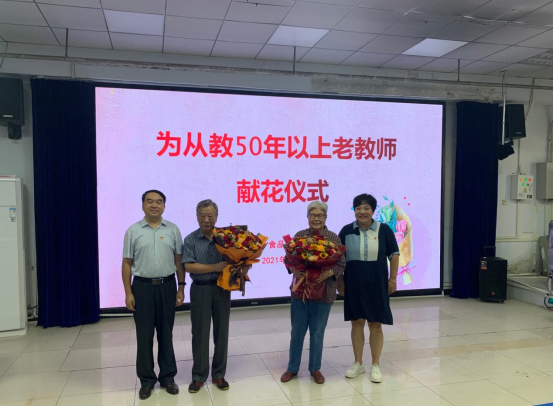 为了弘扬尊师重教的传统美德,感恩、赞颂从教50年以上退休教师邓学法教授和刘勉芝教授“润物无声 桃李芬芳”为国家培育栋梁之才的奉献精神,院长李光磊、学院党委副书记刘克平为两位老教师献花,对他们多年来为学校和学院发展所做的贡献致以真诚的感谢和祝福。