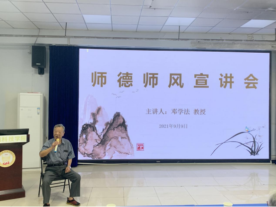 邓学法教授围绕“发扬艰苦奋斗精神”和“如何当好一名教师”展开师德师风宣讲。他以食品学院的发展史为切入点,讲述了老一代教师如何在学院创建初期极度艰苦的环境下攻坚克难、百折不挠的精神事迹,为国家培育出了一大批以侯建光、孙君庚等代表的食品行业领军人才和技术骨干。邓学法结合自己的从教体会,对教师们提出了三点殷切希望:一是要不断提升自己的德行和专业技术,要有真才实学;二是要潜心育人,刻苦钻研,做好人类灵魂的工程师;三是要增强实践能力和职业道德,全心全意为人民食品健康事业贡献自己的力量。