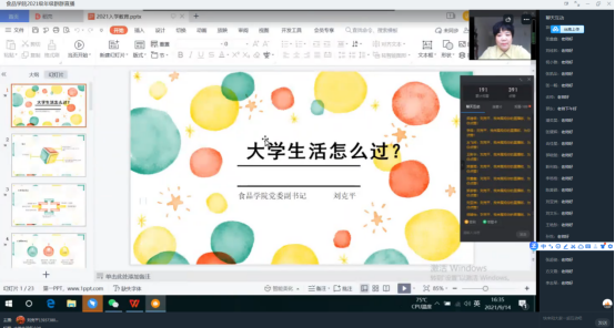 9月14日下午,食品学院党委副书记刘克平以钉钉直播的形式为21级新生讲授“开学第一课”。