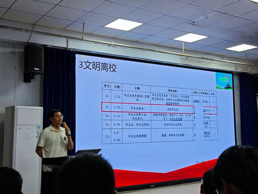 郭延成总结了近期需要完成的工作,分别从就业动员、诚信还款、文明离校、爱心捐赠图书、毕业晚会,以及档案整理等方面详细介绍了学院的安排,并鼓励学生在学院附近打卡拍照、品尝美食,在毕业前弥补“小遗憾”。