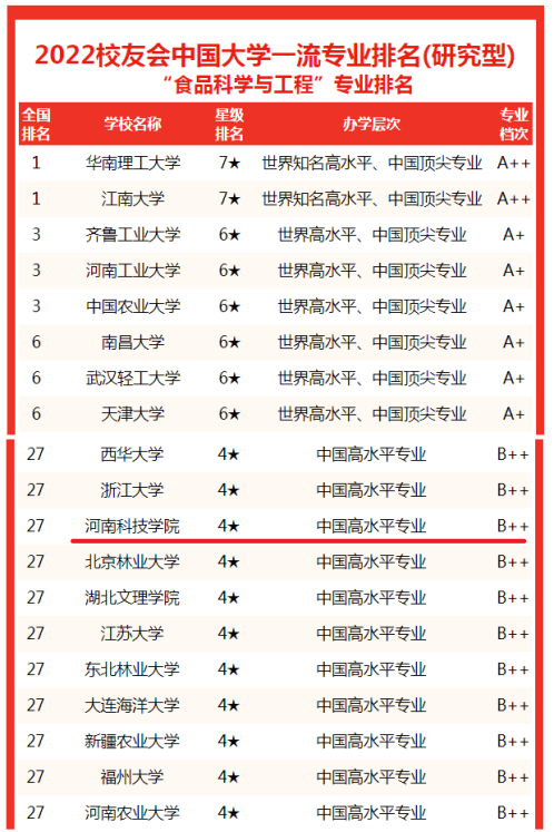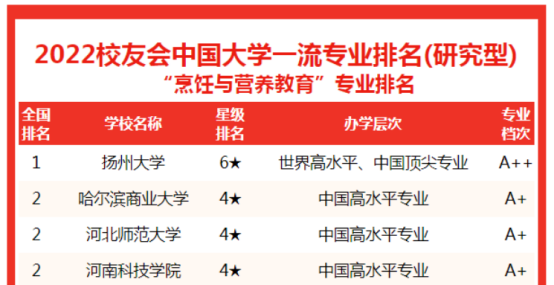 榜单显示,食品学院食品科学与工程专业位列食品科学与工程专业排名(研究型)并列第27名,获四星级(4★)、进入中国高水平专业层次B++专业档次;烹饪与营养教育专业位列烹饪与营养教育专业排名(研究型)并列第2名,获四星级(4★)、进入中国高水平专业层次A+专业档次。