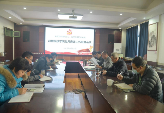 11月17日下午,动物科技学院在E302会议室召开党风廉政工作专题会议,学院党政班子及全体党支部书记参加会议。会议由党委书记郭东升主持。