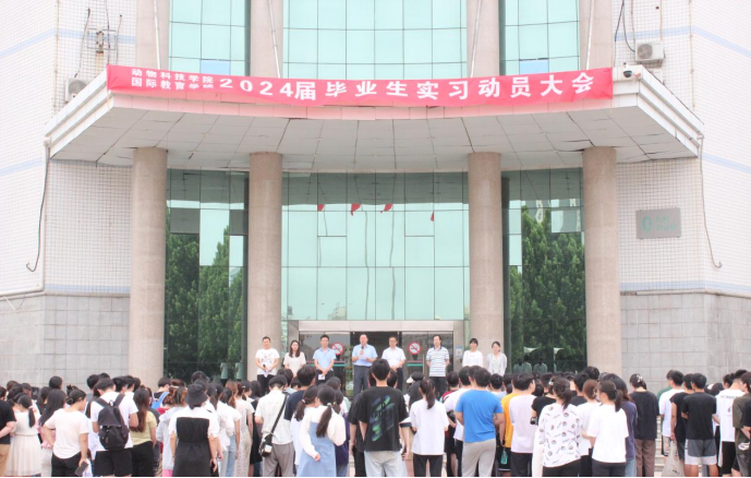为进一步做好学生实习工作,引导学生做好实习前的各项准备,6月16日上午,动物科技学院在零号教学楼前召开2024届毕业生实习动员大会,国际教育学院副院长沈军,动物科技学院教授陈金山、副院长王磊及辅导员老师出席会议,动物科技学院2020级全体学生及国际教育学院2020级动医中外专业全体学生参加。大会由动物科技学院团委副书记刘璐主持。
