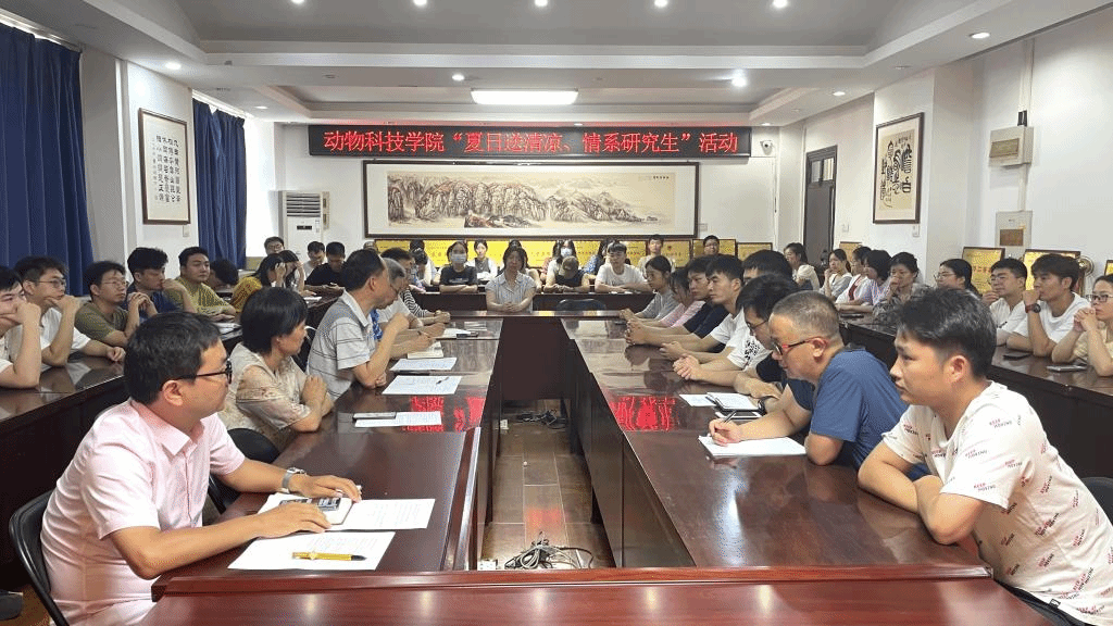 7月11日下午,动物科技学院在E302会议室开展了“夏日送清凉、情系留校生”活动,学院领导班子成员及全体留校研究生参加大会,会议由副院长徐彦召主持。