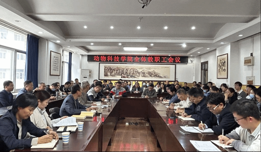 10月12日下午,动物科技学院在E302会议室召开全体教职工大会,学院领导班子成员及全体教职工参加会议,会议由学院党委书记胡付广主持。