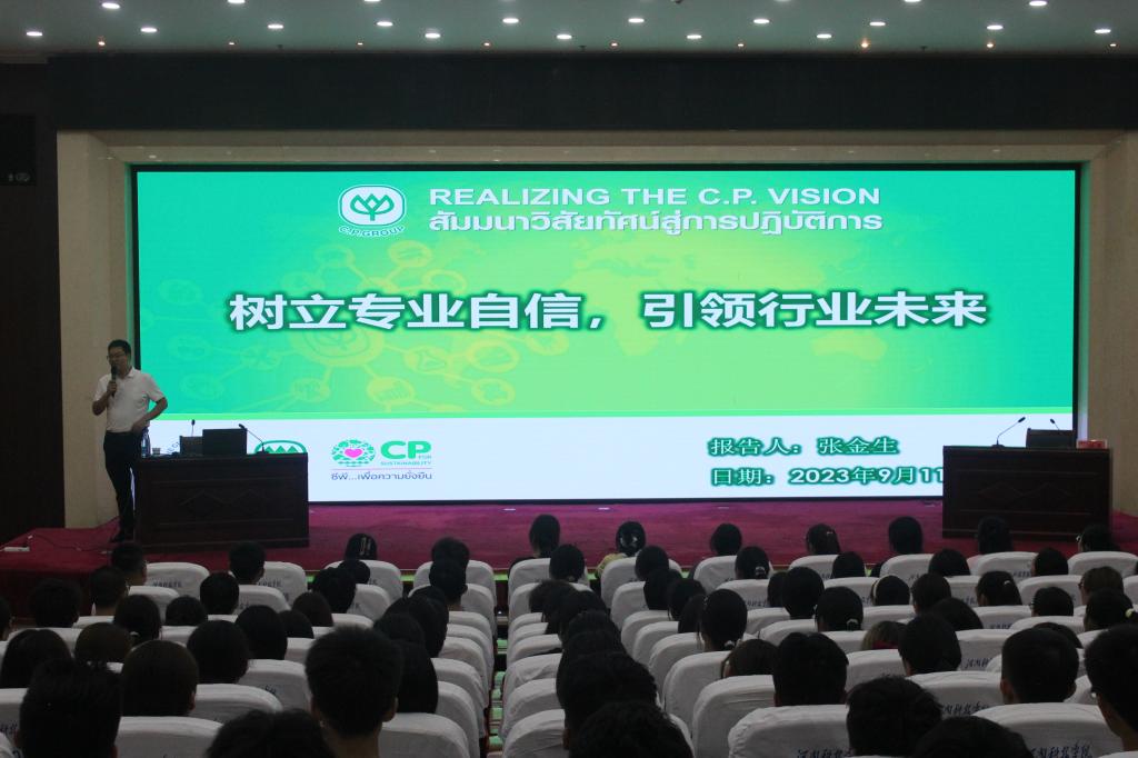 9月11日上午,动物科技学院在办公楼308多功能报告厅举办励志成才报告会,开封正大有限公司总经理张金生先生应邀作报告,报告会由副院长徐彦召主持,2023级300余名新生参加了本次报告会。