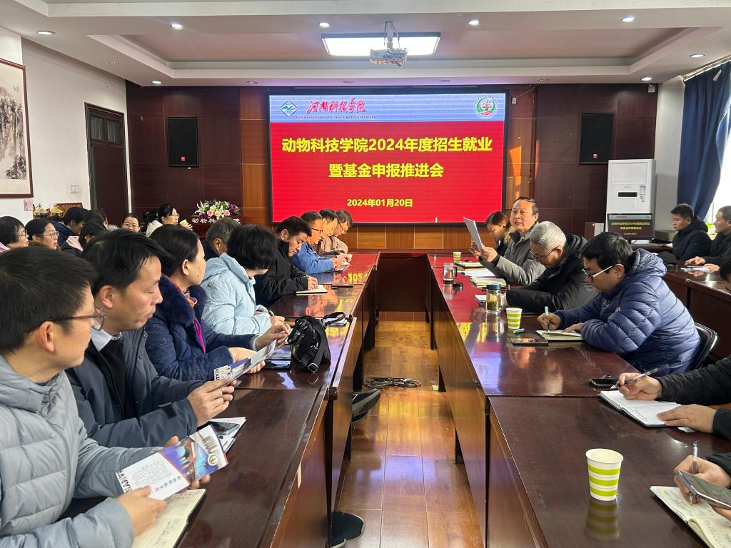 1月20日上午,动物科技学院在E302会议室召开2024年度招生就业暨基金申报推进会,学院领导班子成员及全体教职工参加会议,会议由学院党委书记胡付广主持。