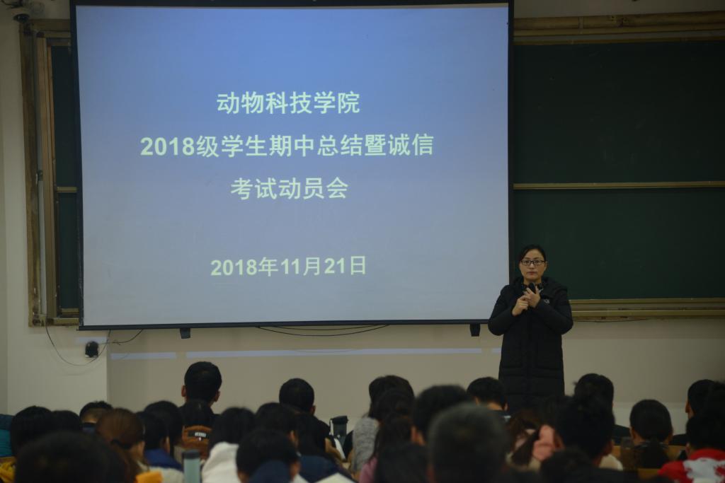 为了帮助同学们掌握学习方法,营造良好的学习氛围,树立诚信为本的道德观念,进一步推进公平公正的考风考纪建设,我院于11月21日在零合四教室举办了“动物科技学院2018级学生期中总结暨诚信考试动员会”。团委书记郑素玲和2018级全体学生参加会议