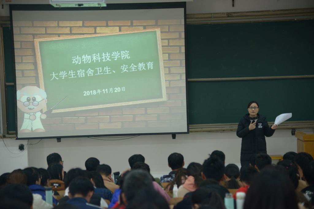 11月20日上午,动物科技学院全体新生在0#四参加由团委书记郑素玲讲授的宿舍卫生安全教育讲座。