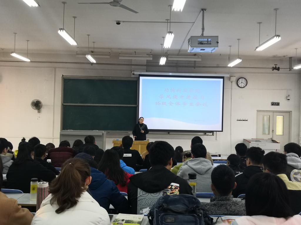 为加强学风建设,提高学生自我学习自我管理意识,2018年11月21日下午,动物科技学院2016级辅导员高莉老师组织2016级全体学生在0合三召开了学风提升建设月学生会议,并组织全体学生签订承诺书。