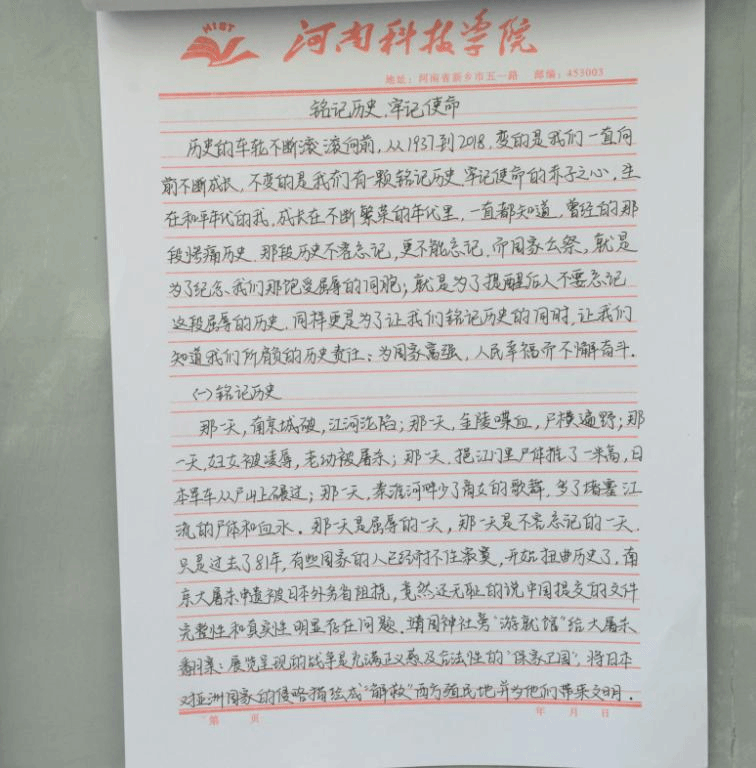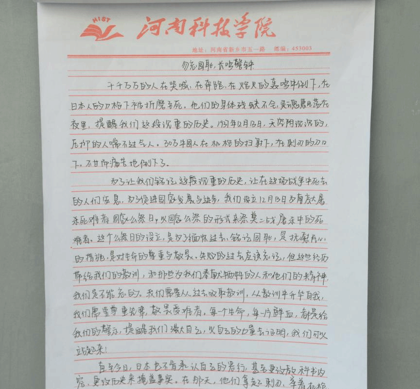 在我国第五个国家公祭日到来之际,动物科技学院开展“国家公祭日”主题手抄报和主题征文活动,活动自12月3日开始进行征集,截止12月11日,共收到作品100余份。