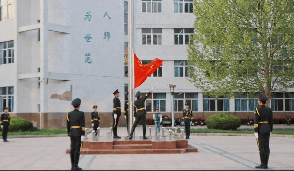 迎着东方的晨曦,国旗护卫队迈着整齐坚定的步伐护送五星红旗来到国旗台,伴随着雄壮激昂的《义勇军进行曲》,全体师生庄严肃立,面向国旗行注目礼,齐唱国歌,五星红旗冉冉升起。