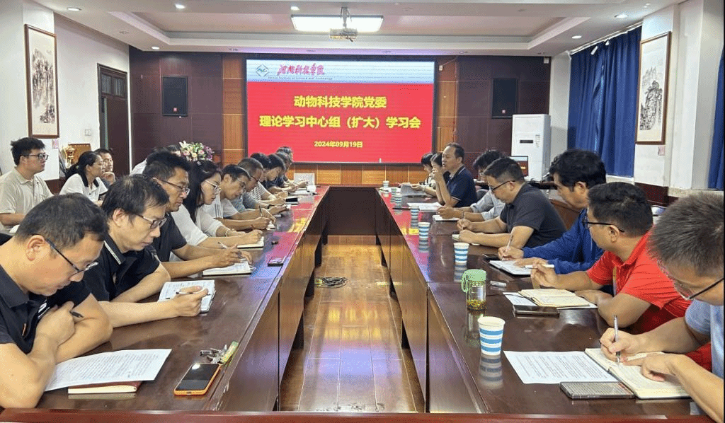 9月19日上午,动物科技学院在E302会议室召开理论学习中心组(扩大)学习会,学院领导班子、科级及以上干部参加会议,会议由学院党委书记胡付广主持。资源与环境学院党委书记王鲁伟、党委宣传部理论教育科科长杨运华列席会议。