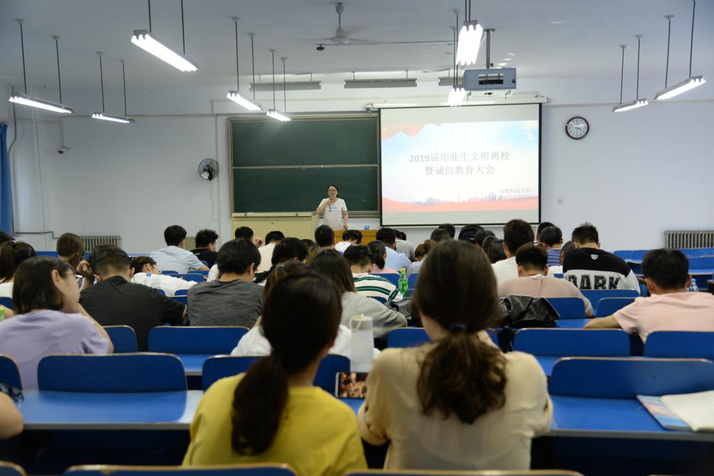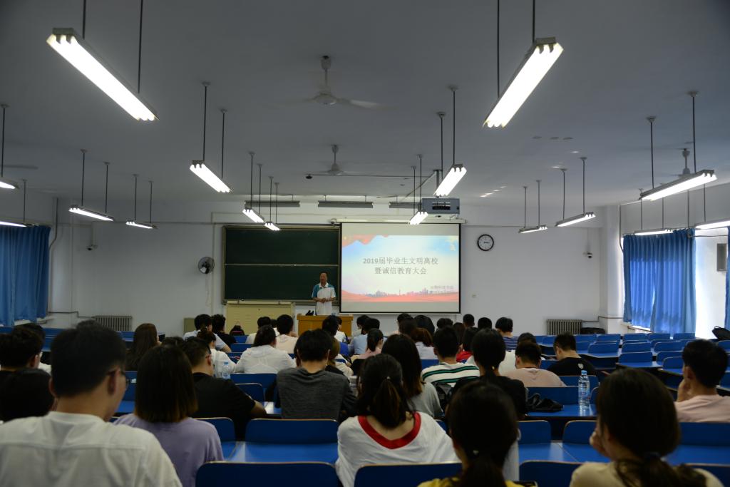 5月22日下午3点,我院在教学楼五合二召开了2019届毕业生文明离校暨诚信教育大会。学院团委书记张书响、正科级辅导员高莉与2019届全体毕业生参加了大会。