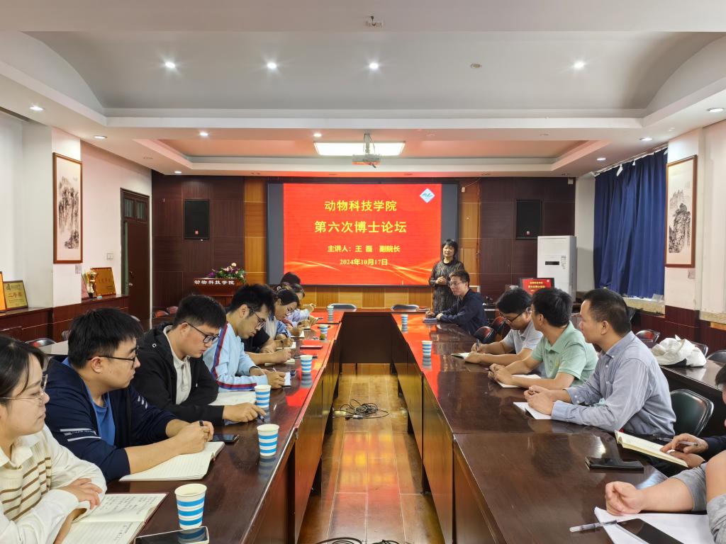 10月17日下午,动物科技学院第六次博士论坛在E302会议室举办。此次论坛由动物科技学院副院长王磊主讲,动物科技学院的青年博士及部分国基申报教师参加了此次博士论坛。会议由副院长贺永惠主持。