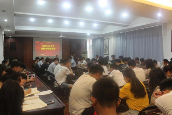为了严肃考风考纪,加强我院学生的诚信教育,培养自立自律、刻苦学习的优良品格,营造良好的道德氛围,6月24日下午,动物科技学院召开“诚信考试动员大会”,号召学生文明诚信参加考试,全体辅导员、2017、2018级班长、团支书以及部分学生参加了此次会议。