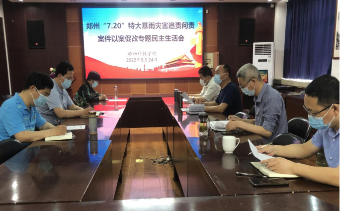 5月24日上午,动物科技学院在E302会议室召开郑州“7·20”特大暴雨灾害追责问责案件以案促改专题民主生活会,学院班子成员参加会议。会议由学院党委书记郭东升主持。
