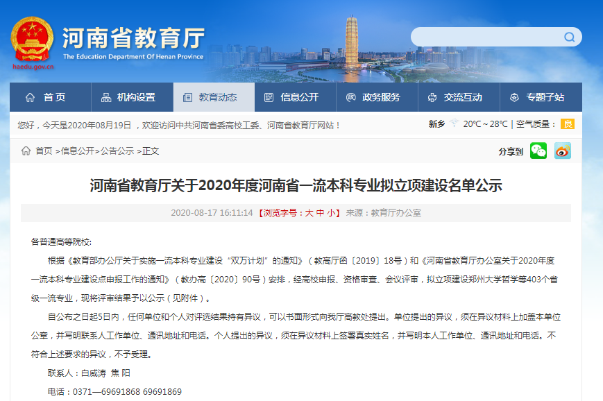2019年4月,教育部启动一流本科专业建设“双万计划”,提出2019年—2021年建设10000个左右国家级一流本科专业点和10000个左右省级一流本科专业点。根据《教育部办公厅关于实施一流本科专业建设“双万计划”的通知》(教高厅函〔2019〕18号)和《河南省教育厅办公室关于2020年度一流本科专业建设点申报工作的通知》(教办高〔2020〕90号)安排,经高校申报、资格审查、会议评审,河南省教育厅拟立项建设郑州大学哲学等403个省级一流专业。