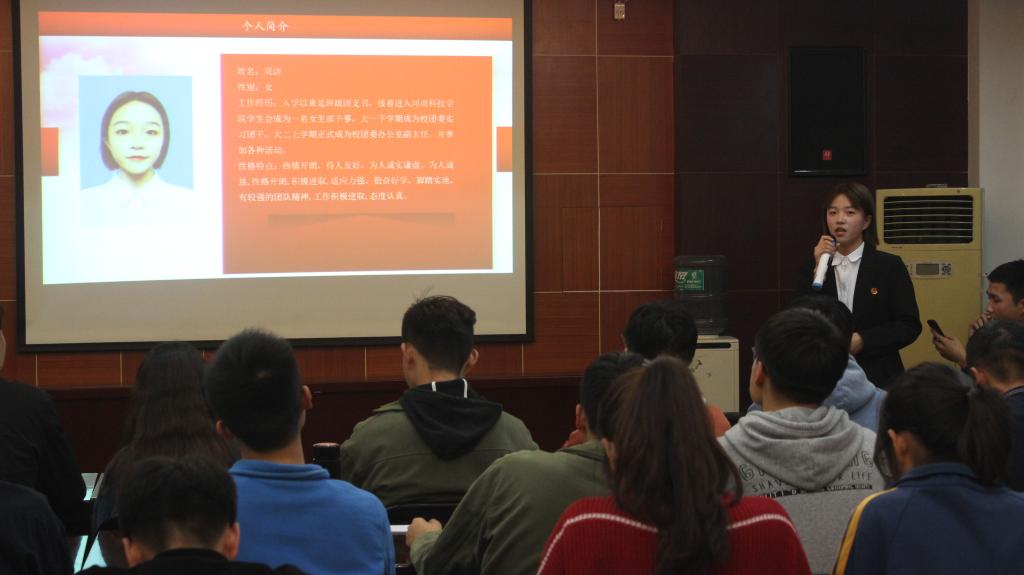 比赛伊始,主持人介绍本次比赛的规则及评分标准。在自由演讲环节,选手们以PPT的形式,围绕基层团建的组织介绍、建设过程、制度纲要、学生培养、特色活动等方面进行演讲。在演讲过程中选手们纷纷表示在今后的学习和工作中,将会不断提升自我,服务同学,奉献校园,争做优秀团员。最后,学生会副主席韩亚钊对参赛选手进行点评,他对选手们的表现给予充分肯定,并针对选手们的不足提出改进意见,同时鼓励团学干部们勇于挑战、勇于接受、勇于担当。