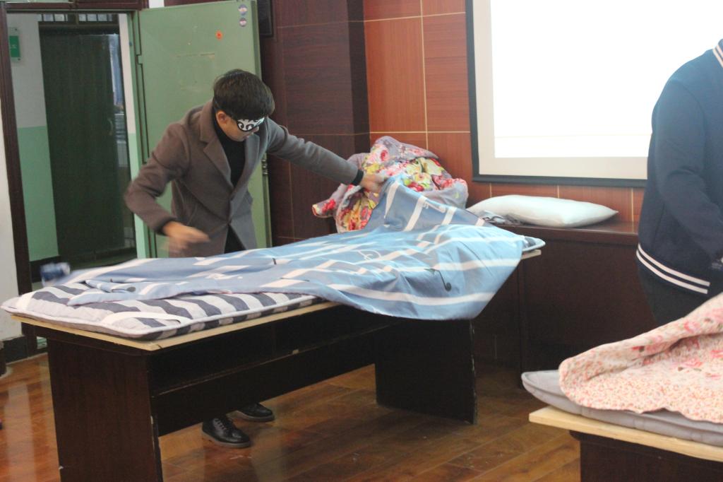 比赛期间,各寝室的参赛代表表现出极大的热情,斗志高昂,全身心投入到比赛中,认真按照评比标准和要求完成了比赛内容,给大家带来视觉上的愉悦。在第一环节“疯狂鞋带”中,各组选手自由发挥,给大家带来各种各样的花式系鞋带方法,比如紧紧相扣式、竹条编织式、蝴蝶式等,都让大家大开眼界。第二环节“穿针引线”中,平时看似粗犷的男同学们干起针线活来与女同学相比也不逞多让。经过男女寝室激烈的比拼,“穿针引线”环节的比赛,被男生拔得头筹。第三环节“超级豆腐块”将比赛推向了高潮,哨声响起,同学们就以最快速度整理被褥、平整床铺。不一会儿,被子就被叠得有棱有角,床单铺得毫无褶皱,选手们的精彩表演为他们赢得了阵阵掌声。