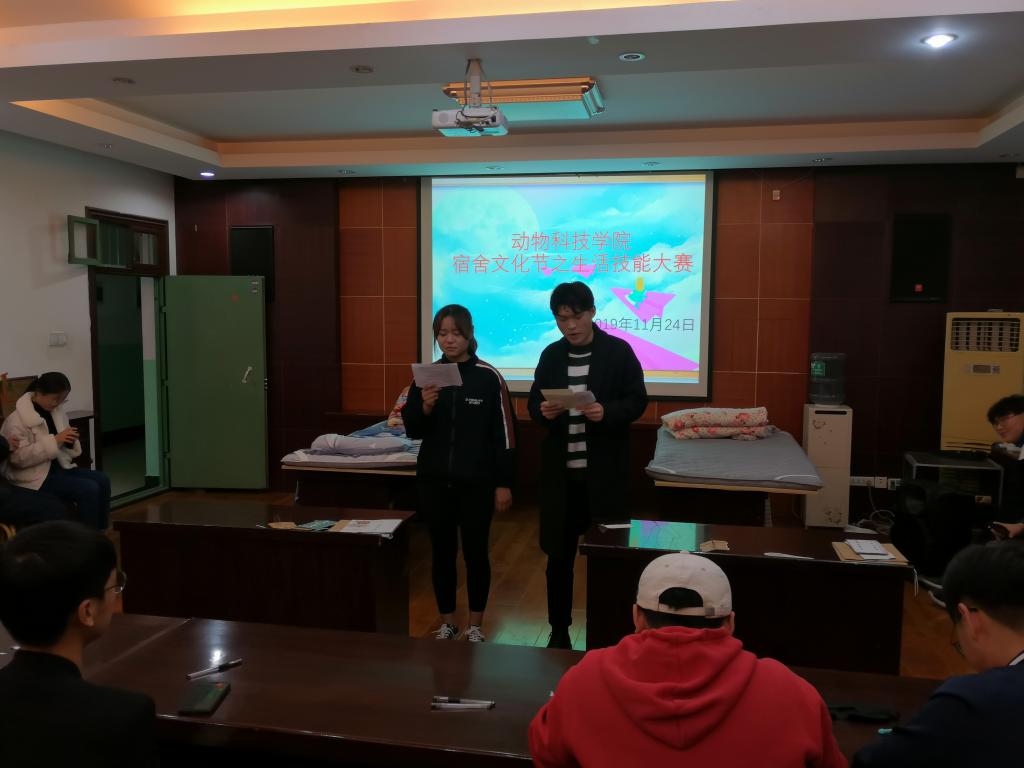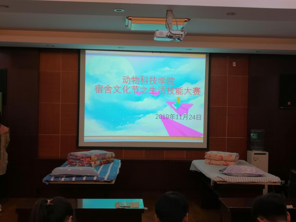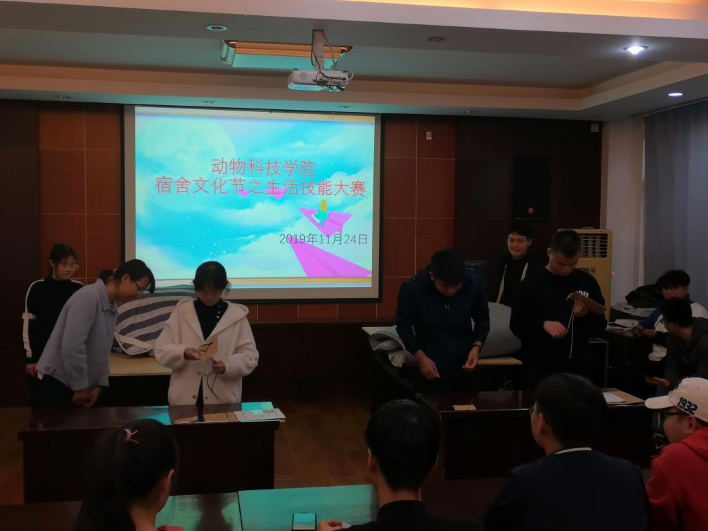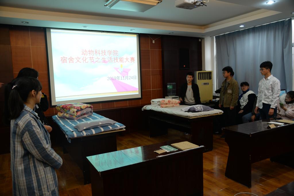 为培养学生良好的生活习惯,创建卫生、文明、整洁的宿舍生活环境和提高学生综合素质水平。11月24日,动物科技学院在E302举行宿舍文化节——宿舍生活技能大赛。2019级入围决赛的16间代表宿舍参与比赛。比赛共分为三个环节:“疯狂鞋带”、“穿针引线”和“超级豆腐块”。