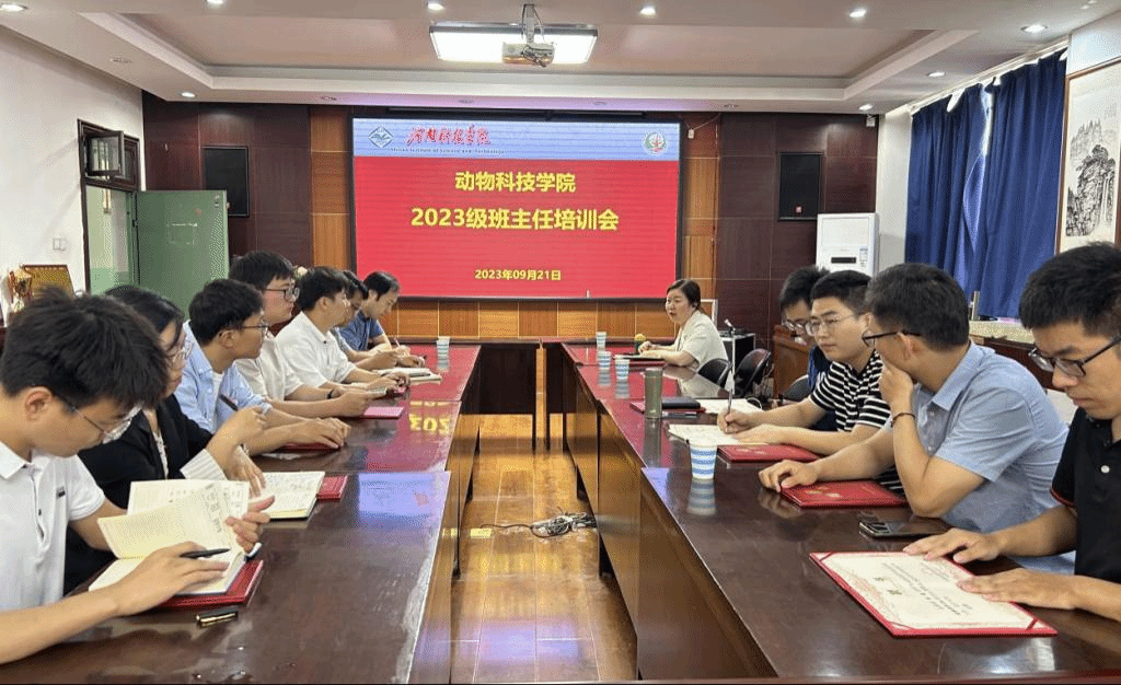 9月21日下午,动物科技学院在E302会议室召开2023级班主任聘任仪式暨班主任培训会,学院领导班子成员及全体教职工参加会议,会议由院党委书记胡付广主持。