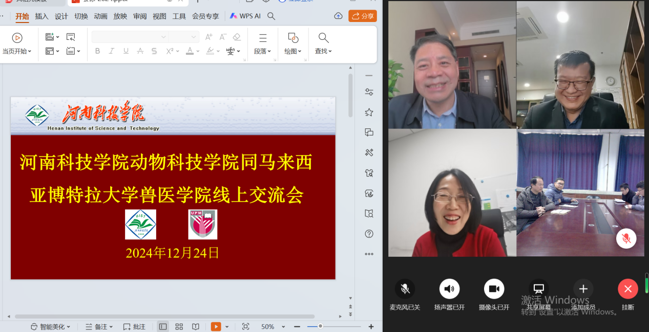 在随后的讨论交流环节,双方围绕科学研究、本科生培养、博士点建设、课题合作等议题展开了深入的讨论,并就未来可能的合作方向进行了深入的探讨。双方均表示,将以此次会议为契机,进一步加强交流与合作。此次线上交流会议的成功举办,不仅为河南科技学院动物科技学院与马来西亚博特拉大学兽医学院搭建了沟通与合作的平台,也为双方未来的深入合作奠定了坚实的基础。相信在双方的共同努力下,两校将在动物科学和兽医学领域取得更加丰硕的成果。