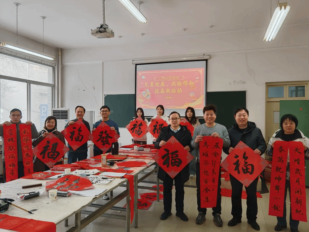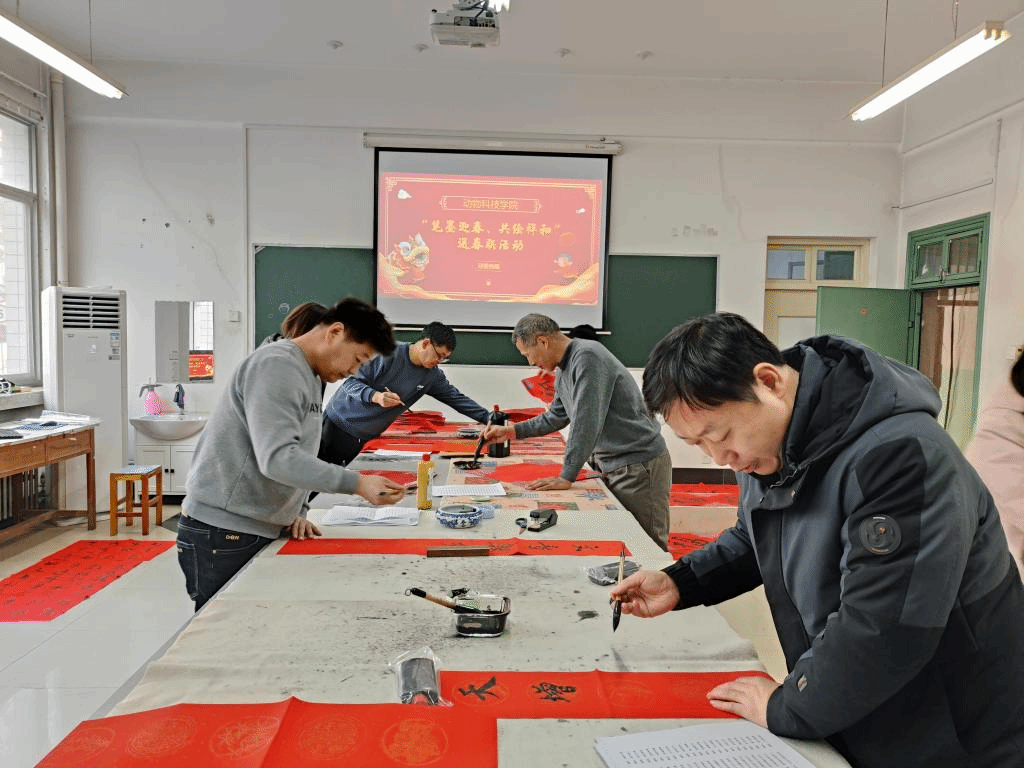 在2025年新春佳节即将来临之际,为营造祥和、欢乐、喜庆的节日氛围,1月3日-6日动物科技学院在E103会议室开展了“笔墨迎春 共绘祥和”迎新春送春联活动。校书法协会部分老师应邀参加此次活动。