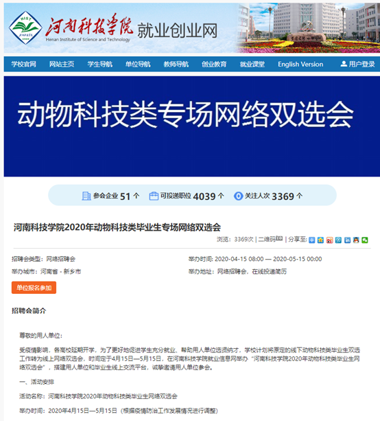 疫情阻挡了我们返校的脚步,但网络使我们在线上重聚。为了拓宽就业渠道,促进动物科技学院2016级毕业生能够顺利毕业就业,帮助用人单位招纳贤才,在校院领导和广大对口企业的大力支持下,我院依托河南科技学院就业创业网、微信、钉钉等平台举办了河南科技学院2020年动物科技类毕业生网络双选会(网址:http://hist.jysd.com/largefairs/view/id/1638/domain/hist),双选会于4月15日正式启动。
