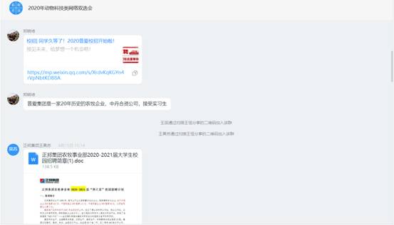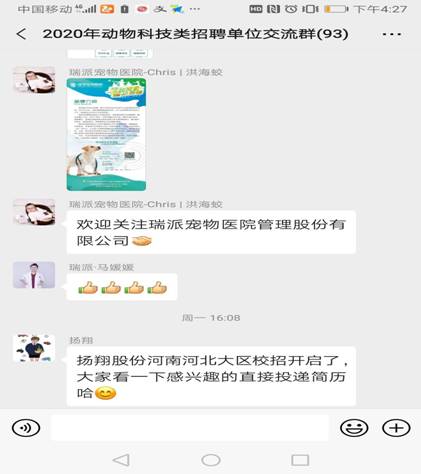 自3月初学院就多次通过各级视频会议,积极部署筹备网络双选会,迅速成立了网络双选会工作领导小组,负责全面协调及工作会务安排。4月1日起,分别在河南科技学院就业创业网、学院官网、学院动科青年微信公众号上发布了双选会招聘公告,并主动联系企业库中的100余家企业,确定过半企业有招聘需求后,创建动物科技类招聘单位微信交流群,目前已有80余家用人单位进入。同时创建了动科学院网络双选会钉钉群,目前50家通过审核的企业面向我院740名毕业生和实习生进行面对面交流。经过多方努力最终实现了用人单位依靠多个网络平台,进行线上发布公告及宣讲招聘,为毕业生实习生拓宽就业渠道,提供了真实可靠的招聘信息,保证了双选会顺利开展。