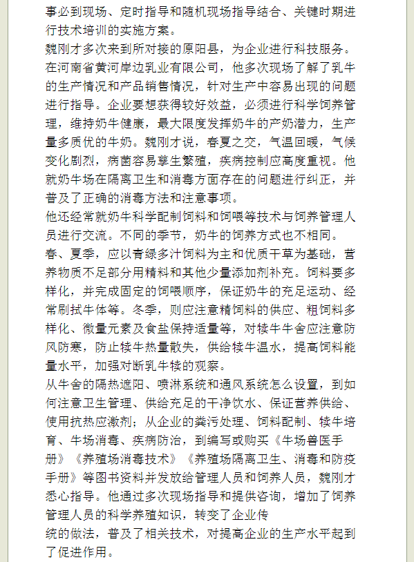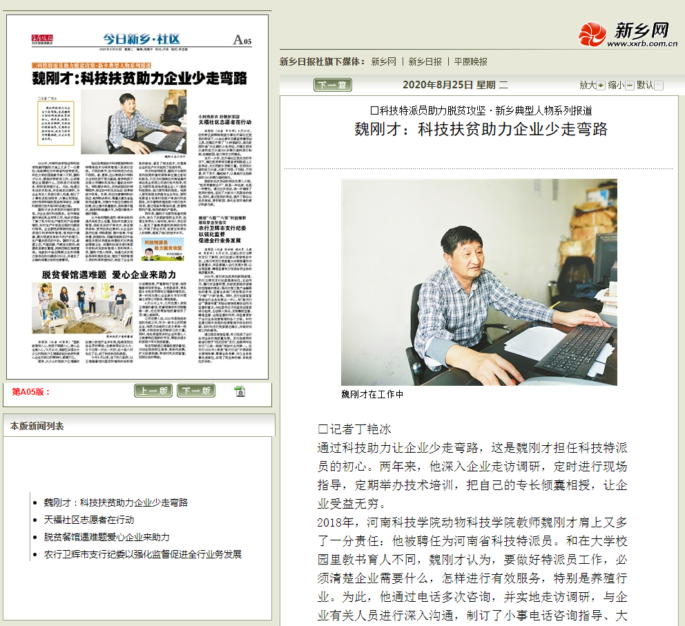 多年来,动物科技学院认真贯彻落实习近平总书记重要指示精神和校党委安排部署,每年选拔、安排科技特派员深入企业走访调研,定时进行现场指导,定期举办技术培训,把自己的专长倾囊相授。新乡日报对此进行报道,并对我院科技特派员魏刚才教授进行了专访。