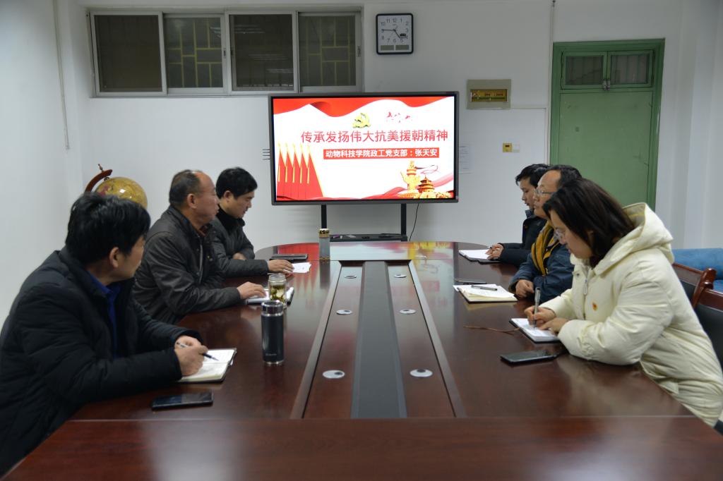 会议还邀请了动物科技学院党建组织员张天安为大家上党课。张老师以《传承发扬伟大抗美援朝精神》为题,从“抗美援朝战争锻造形成伟大抗美援朝精神”“深刻理解伟大抗美援朝精神的时代内涵”“把新时代中国特色社会主义伟大事业不断推向前进”三个维度阐释伟大抗美援朝精神,内容翔实、有理有据,与会党员受益匪浅。