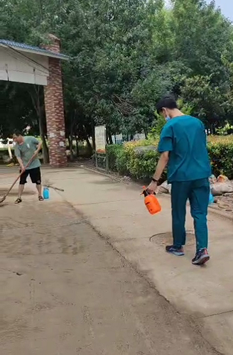 25日,天总算放晴,动物医院组织人员进行有序的卫生清扫和全面消杀工作。晚上10点,杨雪峰教授劳累几天后返回学校居住,并叮咛研究生要注意安全。