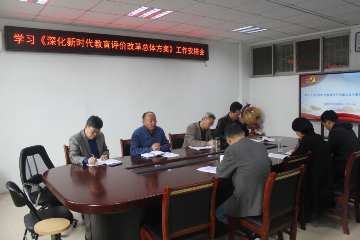 书记郭东升就如何抓好贯彻落实提出三点要求:一要抓好《总体方案》的学习研讨、培训辅导和宣传引导工作;二要聚焦重点难点抓落实;三要结合实际,积极探索推进教育评价改革的好思路、好方法。要坚持效果导向,强化系统思维,压实责任担当,确保教育评价改革关键领域取得实质性突破。