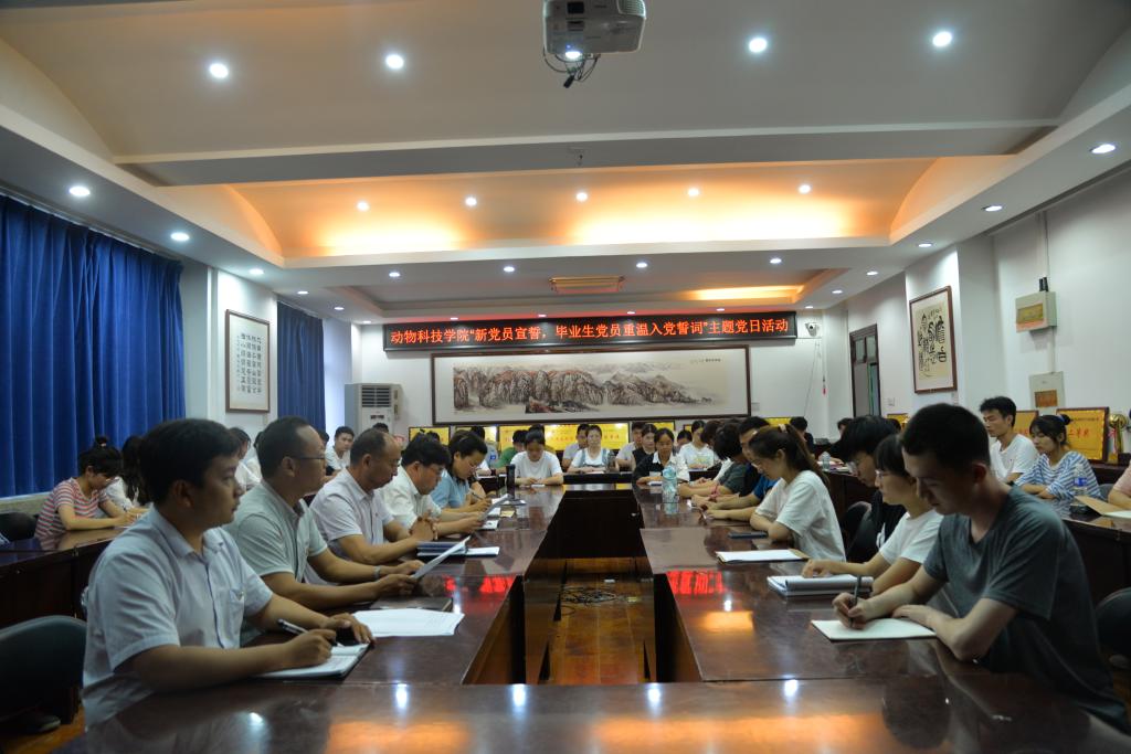 为进一步加强党员党性教育,强化党员宗旨意识,切实增强广大党员的责任感、使命感和荣誉感,6月15日,动物科技学院组织开展毕业生党员和新发展党员“重温入党誓词,强化党员意识”主题党日活动。院党委书记郭东升、副书记杨国友,团委全体老师和53位毕业生党员以及36位新发展党员参加了此次活动。