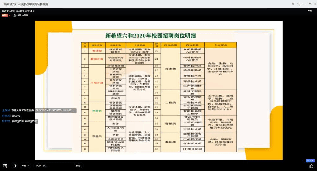 本次招聘会主要面向我院2020届毕业生,同时为2021届毕业生的安全实习提供一个良好的保障。会上,通过PPT宣讲、面对面交流等方式为大家详细地介绍了公司的发展历程、企业现状以及大家最关心的待遇问题。同时,针对不同地区的毕业生,公司提出了就近分配的原则,最大限度减少学生的后顾之忧。会后,招聘老师在群里对大家提出的疑问进行深度解析,保证每一名毕业生全方位了解新希望六合股份有限公司。