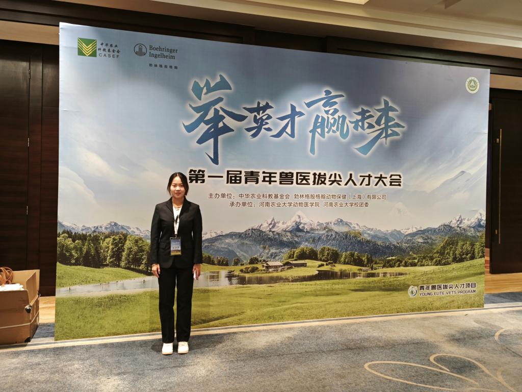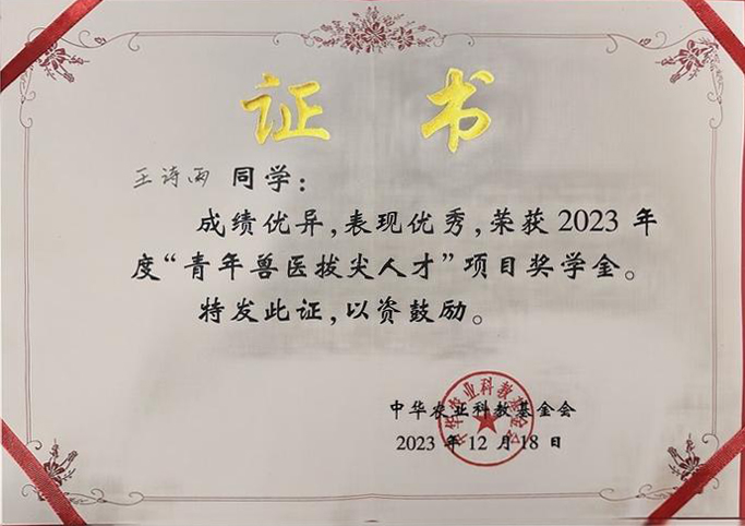 青年兽医拔尖人才项目由中华农业科教基金会携手勃林格殷格翰动物保健(上海)有限公司共同设立,经形式审查、线上评审和终审答辩,最终全国评选出9名“青年兽医拔尖人才”教师和30名“青年兽医拔尖人才”学生(10名本科生、20名研究生)。我院王诗雨同学表现优异,脱颖而出,并成功获得“青年兽医拔尖人才”荣誉。
