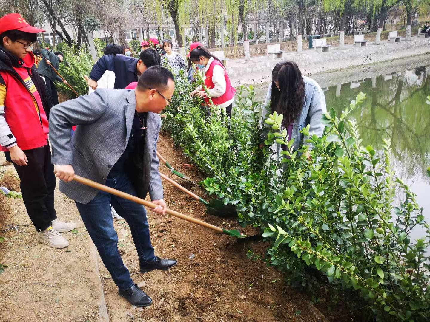 3月10日,动物科技学院在学校西湖水畔举行“青春心向党 志愿新征程”雷锋月志愿服务主题系列活动——“建绿色校园,树绿色理想”校园植树。团委书记张书响,副书记刘璐、张帅鹏和60余名学生志愿者参加。