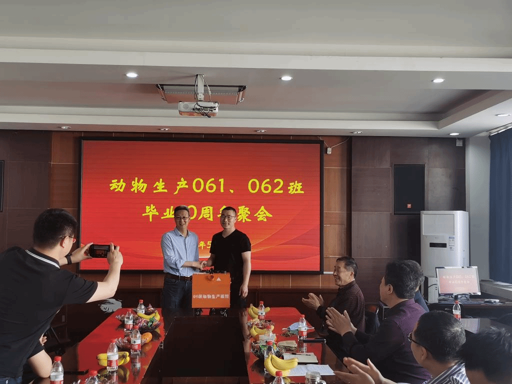 主题班会上,每位校友都发表了“十年感言”,就自己现在的工作、生活情况向老师和同学们作了汇报。大家纷纷表示,是动科学院把大家从全国各地汇聚在一起,组成了这个大家庭,四年的学习生活,收获了知识,也收获了友情,美好的大学生活是每位动物生产06级同学终生难忘的记忆。为感谢母校的栽培,06级同学们向学院捐赠了空气消毒机一台。