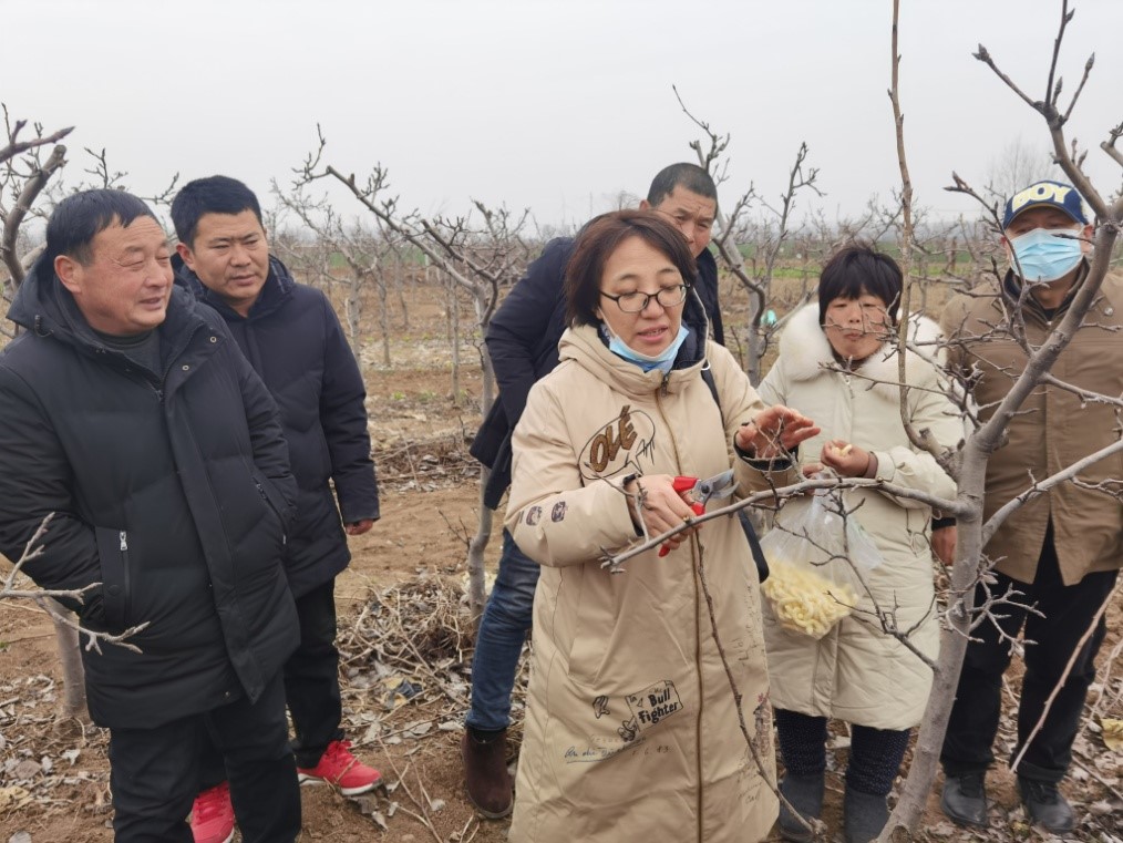 下午,科技服务队来到商水县老城办事处刘口行政村,该村种植梨树农户较多,但多数果农管理粗放,经济效益不佳,周瑞金副教授在了解梨园基本情况后,指出果农修剪中存在的问题,重点对盛果期果树修剪进行示范指导,一是合理留枝,确保果树通风透光,二是调整营养枝与结果枝比例,防止果枝树势早衰。